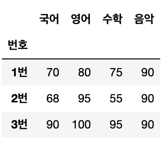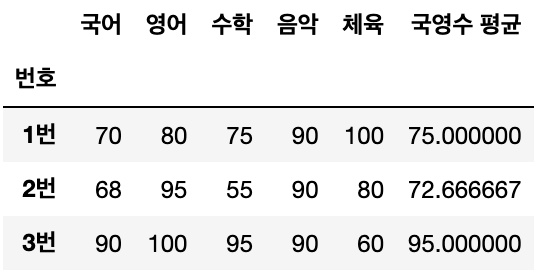 | 3번 | 90 | 100 | 95 | NaN | NaN |